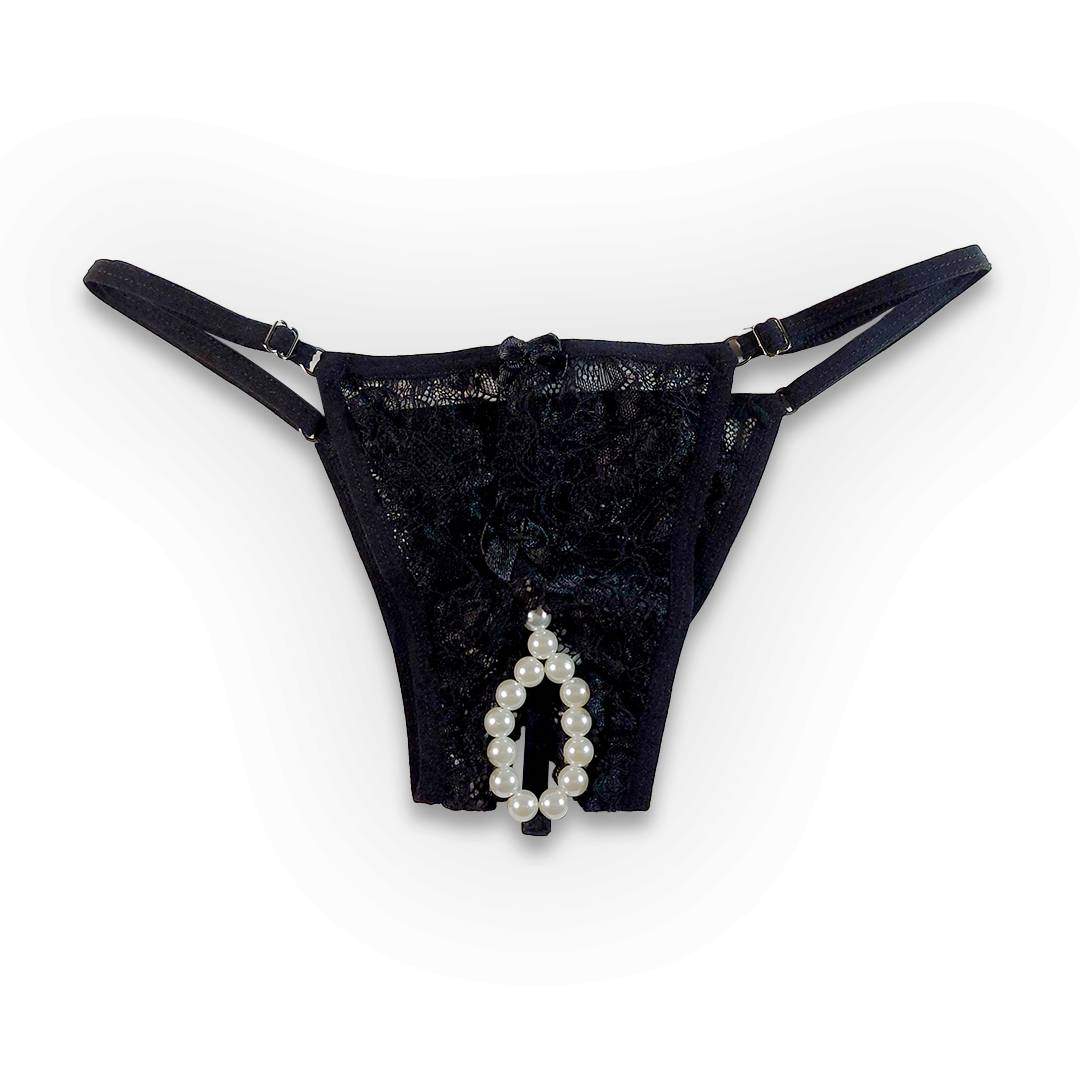 Calcinha Tailandesa na Cor Preto em renda floral com tiras ajustáveis nas laterais e com um detalhe incrível: na parte inferior da calcinha, possui um delicioso Colar de Pérolas que irá te fazer subir pelas paredes de tanto prazer!